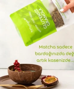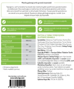 Matcha geleneği ve enerjisi artık granola kaselerinizde… Toprağımsı,zarif lezzeti ile Matchanın sağladığı pozitif enerji,değerli Cranberry taneleri ile buluştu. Matcha tozu ile harmanlanan glutensiz yulaf ezmesine cranberry (turna yemişi kurusu),çilek,elma kurusu,muz,badem,antep fıstığı da eklendi.