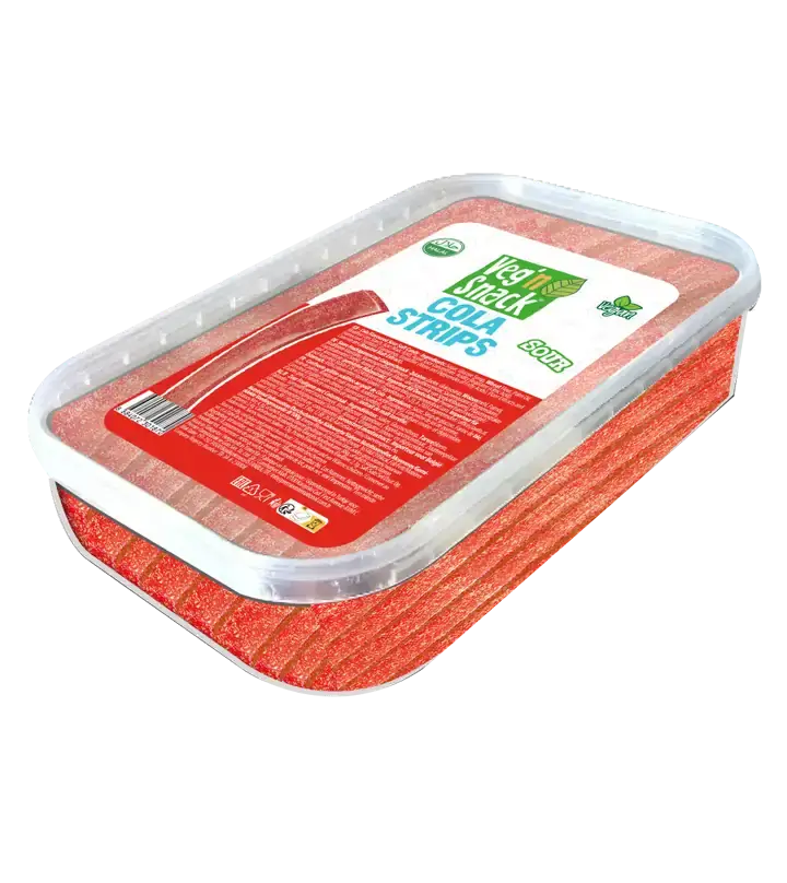 Veg’n Snack Cola Sour Strips – Kola Aromalı Yumuşak Şeker Çubukları -Küvette 200g İçindekiler: Şeker, glikoz şurubu,Buğday unu, palm yağı, modifiye mısır nişastası, malik asit, elma suyu konsantresi, asitlik düzenleyici: sitrik asit, nem vericiler(sorbitol),aroma verici, emülgatör (yağ asitlerinin mono ve digliseritleri) ,kavrulmuş malt ekstraktı.