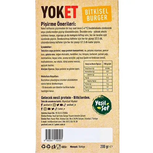 Tüm burger istekleriniz için bitki bazlı nihai seçenek olan lezzetli Yoket vegan burger köftemizle tanışın. GDO’suz soya proteini ile yapılan vegan burger köftemiz, geleneksel etli burgerlerin dokusunu ve tadını taklit edecek şekilde hazırlanmıştır. Bu, onu veganlar, vejeteryanlar veya klasik bir burgerin tadını çıkarırken et tüketimini azaltmak isteyen herkes için mükemmel bir seçenek haline getirir. Köftemiz yüksek protein içeriğine ve gerekli besin maddelerine sahiptir ve geleneksel et burgerlarına karşı sağlıklı, hafif ve doyurucu bir alternatiftir. Doğal malzemeler kullanılarak yapılmıştır, hormonlar, antibiyotikler, gluten ve kolesterol içermemektedir. Böylece diyet kısıtlamaları olanlar için güvenlidir.