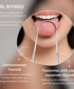 Dil temizleyici, dilin anatomik yapısına göre geliştirilen bir ağız hijyen aparatıdır. Dişlerinizi fırçalamadan önce veya fırçaladıktan sonra dilinizi temizleyebilirsiniz. Dil temizleyici paslanmaz çelikten üretilmiştir. Dil yüzeyindeki bakterileri, ölü hücreleri, gıda artıklarını, sigara kaynaklı biriken plakları temizler. Bakteri kaynaklı ağız kokusunun oluşumunu engeller. Ağız içi temizliğine yardımcı olarak çürük oluşumunun engellenmesine ve üst solunum yolu hastalıklarının önlenmesine yardımcı olur. Dilin sarımtırak renginden doğal pembe görünümüne geçmesini sağlar. Kullanım: Dil temizleyiciyi dil yüzeyinde arkadan öne doğru sürerek kullanın. Çok sert sürmemeye ve fazla bastırmamaya özen gösterin. İlk sıyırmanın ardından aparatı durulayın ve işlemi yineleyin. Yaklaşık bir dakika boyunca dilinizi temizledikten sonra ağzınızı çalkalayın ve aparatı temizleyin.
